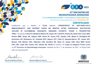 – 1°Lugar Tema oral com o trabalho Chronic use of hydroxychloroquine did not protect against covid-19 in a large cohort of patients with rheumatic diseases in brazil, Sociedade Paulista de Reumatologia. 26º ERA, 2020.
